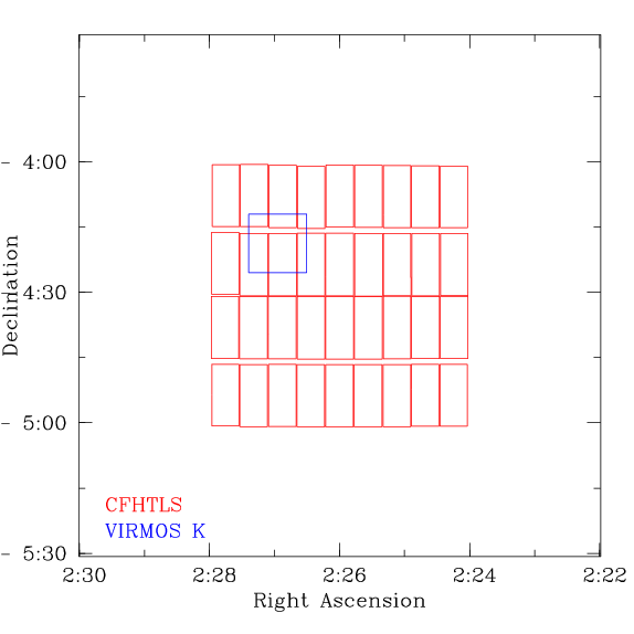D1 optical CFH12K BVRI B=26,V=26,R=26,I=26 complete coverage Stacked images exist but not publicly available. Catalogues available at CESAM part of the VVDS. See McCracken et al. (2003).